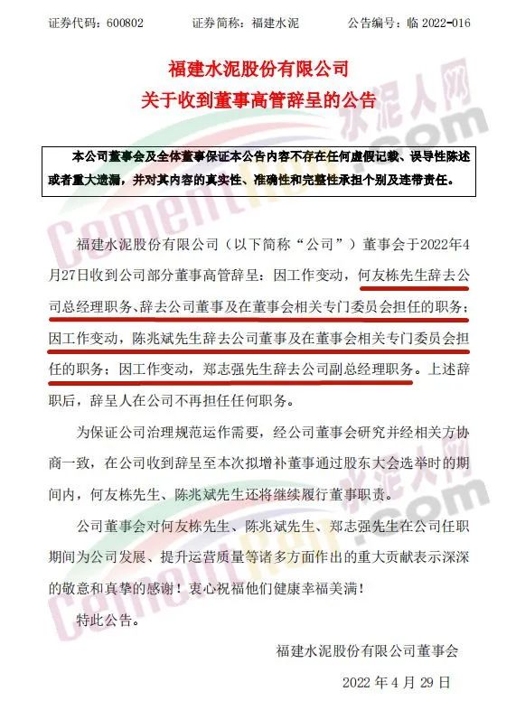 同期,福建水泥股份有限公司發(fā)布《關(guān)于收到董事高管辭呈的公告 》稱,因工作變動(dòng),何友棟先生辭去公司總經(jīng)理職務(wù)、辭去公司董事及在董事會(huì)相關(guān)專門委員會(huì)擔(dān)任的職務(wù);因工作變動(dòng),陳兆斌先生辭去公司董事及在董事會(huì)相關(guān)專門委員會(huì)擔(dān)任的職務(wù);因工作變動(dòng),鄭志強(qiáng)先生辭去公司副總經(jīng)理職務(wù)。