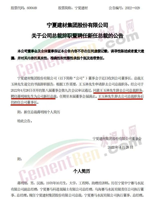 4月28日,寧夏建材集團(tuán)股份有限公司發(fā)布《關(guān)于公司總裁辭職暨聘任新任總裁的公告》稱,同意王玉林先生辭去公司總裁職務(wù),聘任蔣明剛先生為公司新任總裁,任期至本屆董事會(huì)屆滿止。王玉林先生辭去公司總裁職務(wù)后仍擔(dān)任公司董事長(zhǎng)。
