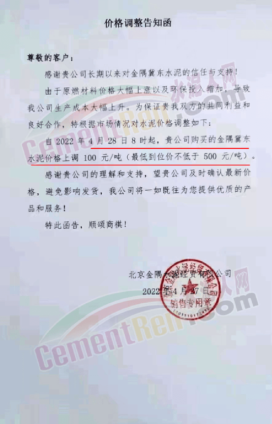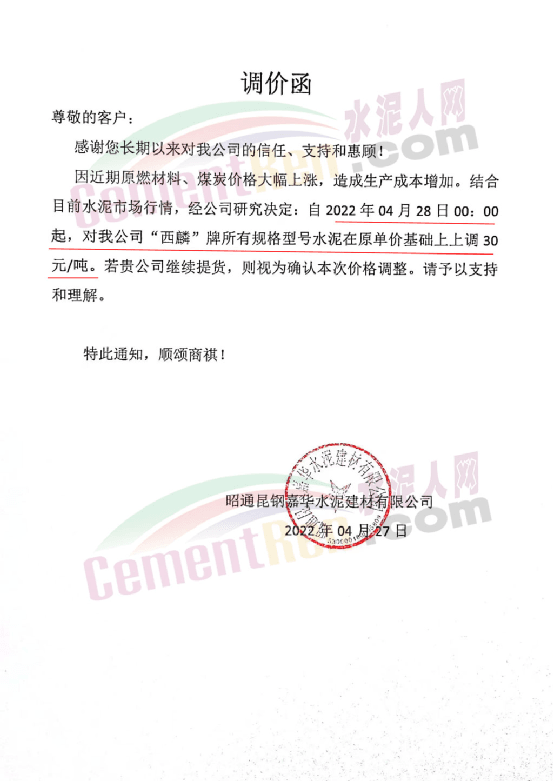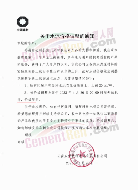 云南永保特種水泥有限責(zé)任公司通知,因各類水泥原材料的緊缺及價格上漲而導(dǎo)致生產(chǎn)成本的上升,故對水泥價格做出調(diào)整以緩解不斷上漲的成本壓力,自2022年4月30日0時起所有區(qū)域所有品種水泥在原價基礎(chǔ)上上調(diào) 30元/噸。