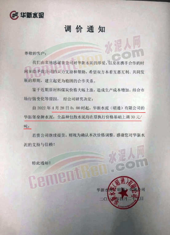 華新水泥(昭通)有限公司通知鑒于近期原材料煤炭價格大幅上漲,造成生產(chǎn)成本增加。結(jié)合市場行情變化等原因,經(jīng)公司研究決定自年4月28日0時起,華新堡壘牌水泥全品種包散水泥均在原執(zhí)行價格基礎(chǔ)上調(diào)30元/噸。