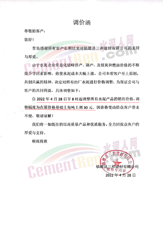 鎮(zhèn)雄縣三和建材有限公司通知由于水泥企業(yè)常態(tài)化錯峰停產(chǎn)、限產(chǎn),及煤炭和燃油價格的不斷提升等因素影響,致使水泥成本大幅上漲。公司本著客戶至上原則,共創(chuàng)共贏的精神,決定對所有出廠水泥進(jìn)行價格調(diào)整,為保證公司與客戶的共同利益,自4月28日早8時起調(diào)整所有水泥產(chǎn)品的銷售價格,調(diào)整幅度為在原價格基礎(chǔ)上上調(diào)30元/噸。