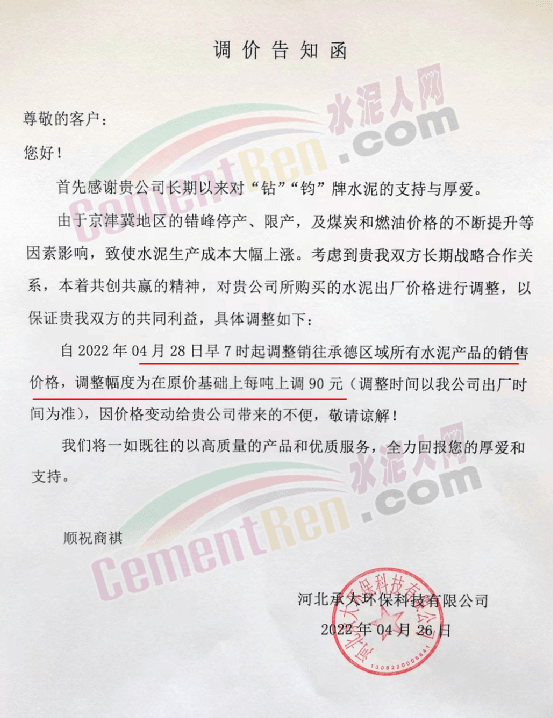 河北承大環(huán)??萍纪ㄖ?,由于京津冀地區(qū)的錯峰停產(chǎn)、限產(chǎn),及煤炭和燃油價格的不斷提升等因素影響,致使水泥生產(chǎn)成本大幅上漲。自4月28日早7時起調(diào)整銷往承德區(qū)域所有水泥產(chǎn)品的銷售價格,調(diào)整幅度為在原價基礎(chǔ)上每噸上調(diào)90元。