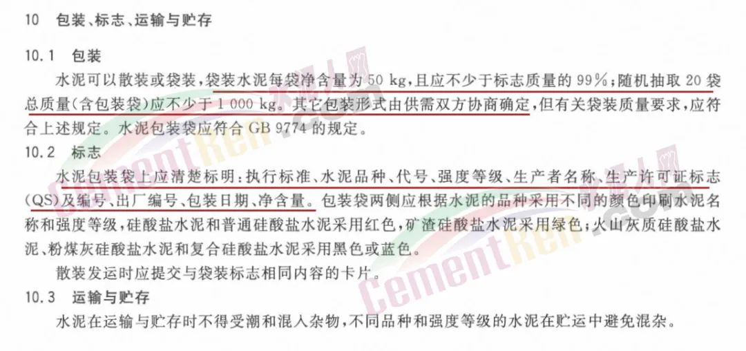 普通硅酸鹽水泥標(biāo)準(zhǔn)GB175-2007第10節(jié)明確,水泥可以散裝或袋裝,袋裝水泥每袋凈含量50kg,且應(yīng)不少于標(biāo)準(zhǔn)質(zhì)量的99%;隨機(jī)抽取20袋總質(zhì)量(含包裝袋)應(yīng)不少于1000kg。其它包裝形式由供需雙方協(xié)商確定,但有關(guān)袋裝質(zhì)量要求,應(yīng)會使上述規(guī)定。水泥包裝袋應(yīng)符合GB9774的規(guī)定。