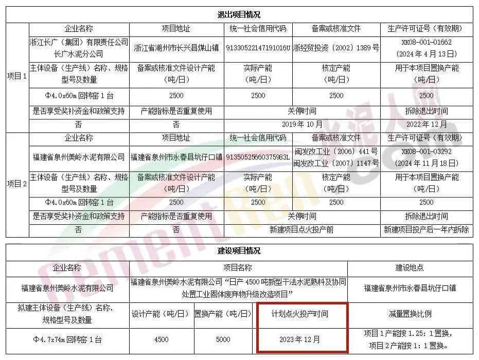 據(jù)水泥人網(wǎng)了解,此前,福建省工信廳曾發(fā)布《關(guān)于福建省泉州美嶺水泥有限公司日產(chǎn)4500噸新型干法水泥熟料生產(chǎn)線建設(shè)項目產(chǎn)能置換方案的公告》,公告顯示,福建省泉州美嶺水泥有限公司“日產(chǎn)4500噸新型干法水泥熟料及協(xié)同處置工業(yè)固體廢棄物升級改造項目”由浙江長廣(集團)有限責任公司長廣水泥分公司2500t/d和福建省泉州美嶺水泥有限公司2500t/d分別按照1.25:1和1:1的置換比例置換而來。計劃點火投產(chǎn)時間為2023年12月。