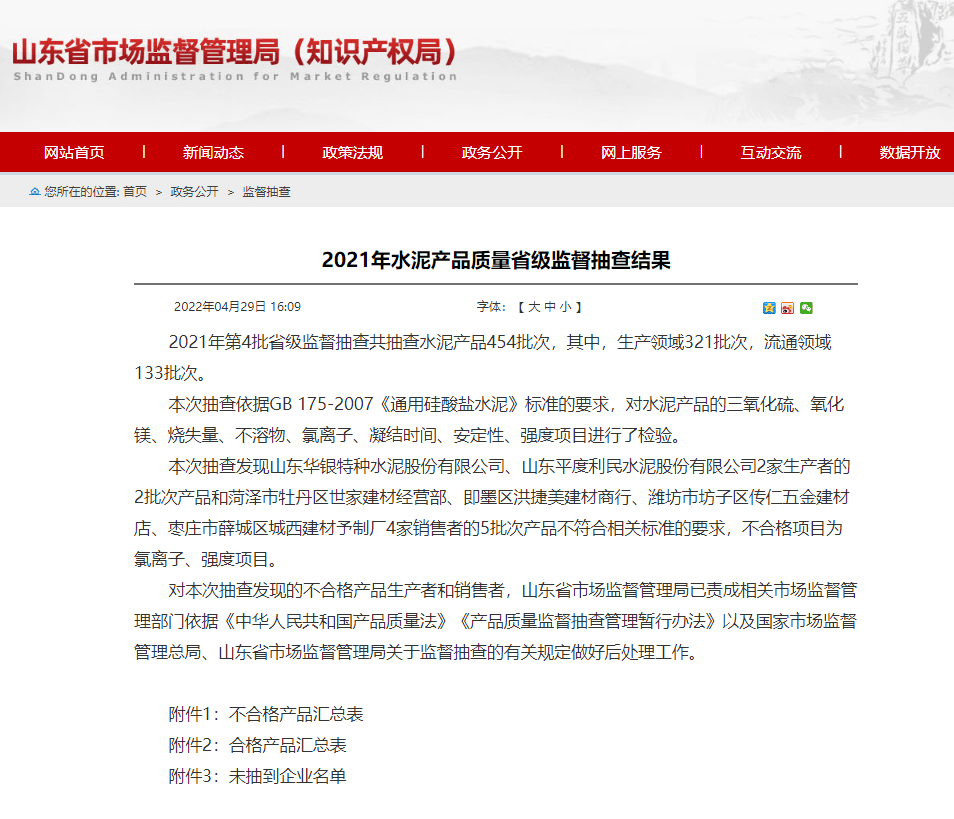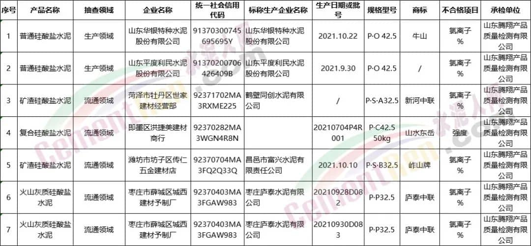 抽查發(fā)現(xiàn)山東華銀特種水泥股份有限公司、山東平度利民水泥股份有限公司2家生產(chǎn)者的2批次產(chǎn)品和菏澤市牡丹區(qū)世家建材經(jīng)營(yíng)部、即墨區(qū)洪捷美建材商行、濰坊市坊子區(qū)傳仁五金建材店、棗莊市薛城區(qū)城西建材予制廠4家銷(xiāo)售者的5批次產(chǎn)品不符合相關(guān)標(biāo)準(zhǔn)的要求,不合格項(xiàng)目為氯離子、強(qiáng)度項(xiàng)目。