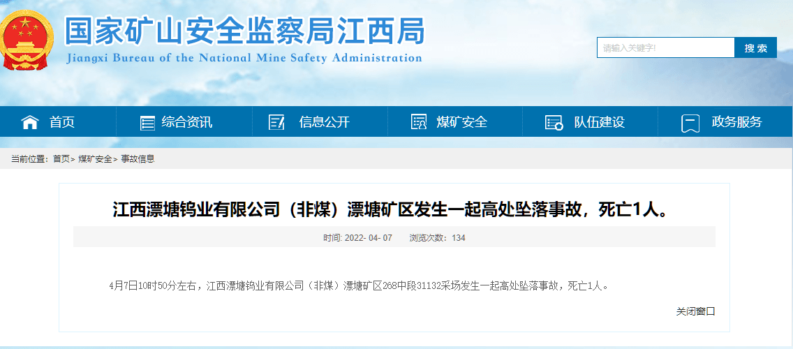 4月7日10時50分左右,江西漂塘鎢業(yè)有限公司(非煤)漂塘礦區(qū)268中段31132采場發(fā)生一起高處墜落事故,死亡1人。
