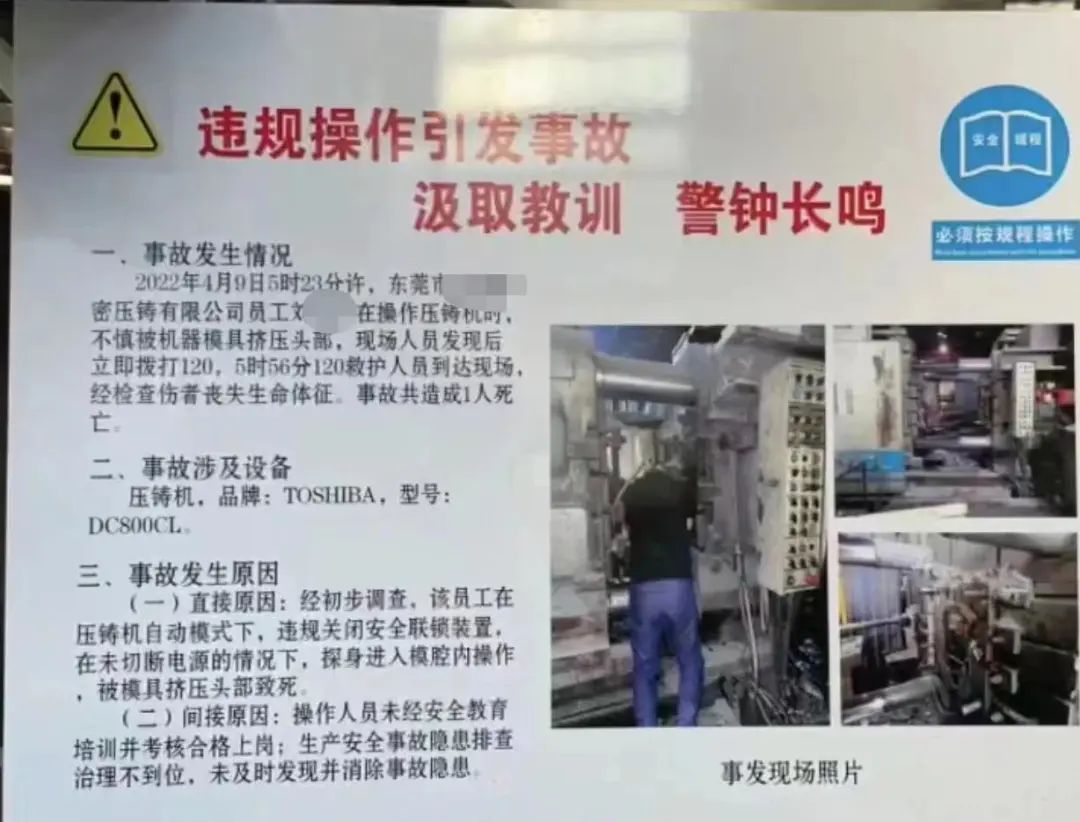 2022年4月9日5時23分許,東莞市某精密壓鑄有限公司員工劉某在操作壓鑄機時,不慎被機器模具擠壓頭部,現(xiàn)場人員發(fā)現(xiàn)后立即撥打120,5時56分120救護人員到達現(xiàn)場,經檢查傷者喪失生命體征。