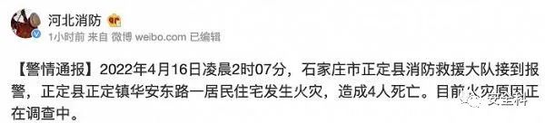 4月16日凌晨2時07分,石家莊市正定縣消防救援大隊接到報警,正定縣正定鎮(zhèn)華安東路一居民住宅發(fā)生火災,造成4人死亡。