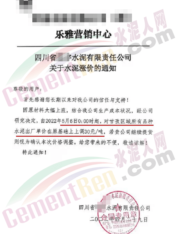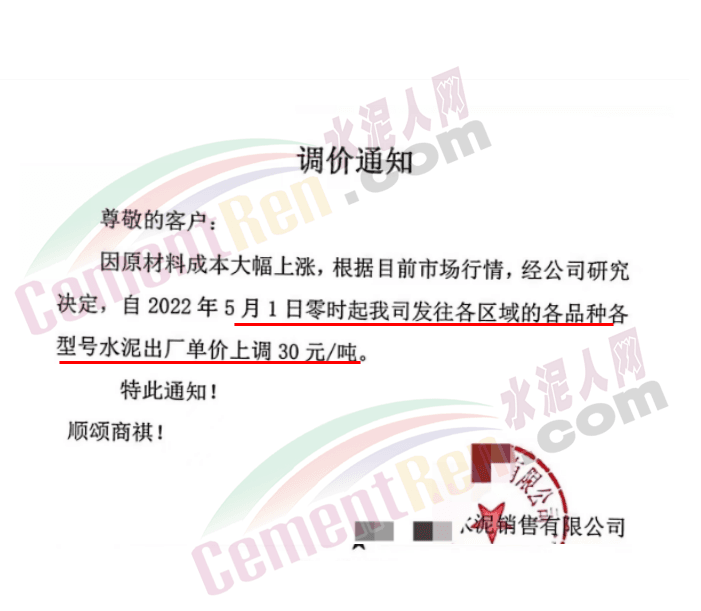 貴州部分水泥企業(yè)通知由于原燃材料價(jià)格上漲,經(jīng)公司研究決定從5月1日8時(shí)起上調(diào)水泥價(jià)格60元/噸。
