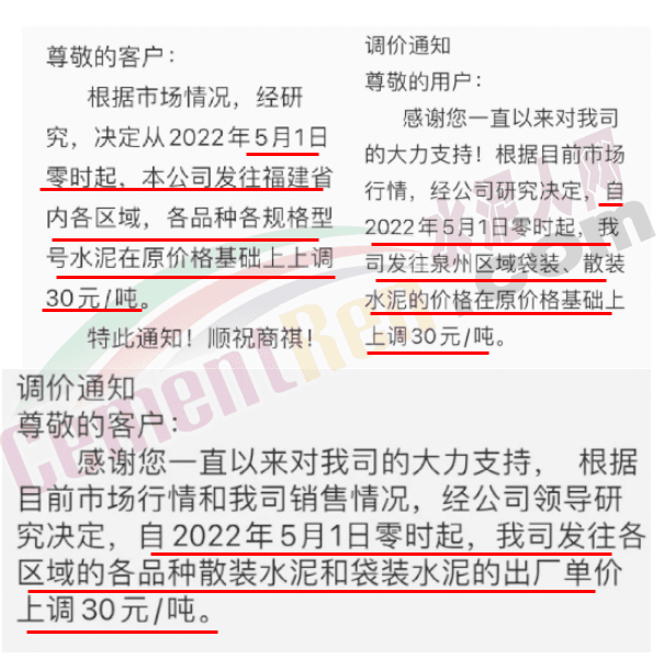 同期,福建區(qū)域多家企業(yè)通知福建省全區(qū)域“普漲30元/噸”,企業(yè)漲價(jià)通知函稱,由于燃煤、用電價(jià)格上漲,加之運(yùn)輸費(fèi)用漲幅明顯,水泥生產(chǎn)經(jīng)營(yíng)成本增加,為轉(zhuǎn)移成本壓力,提升盈利,決定上調(diào)水泥價(jià)格。