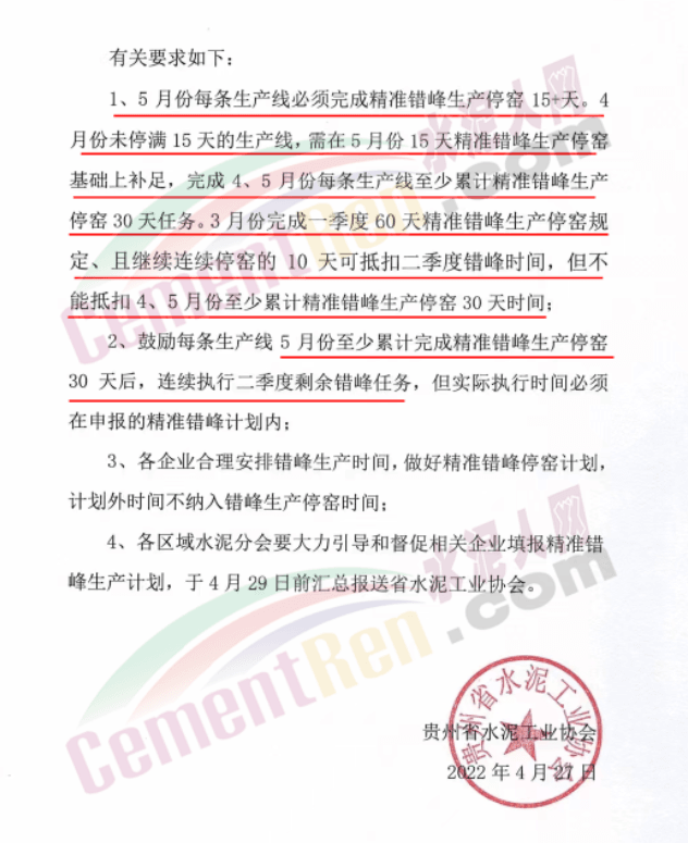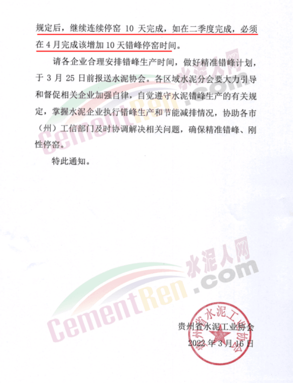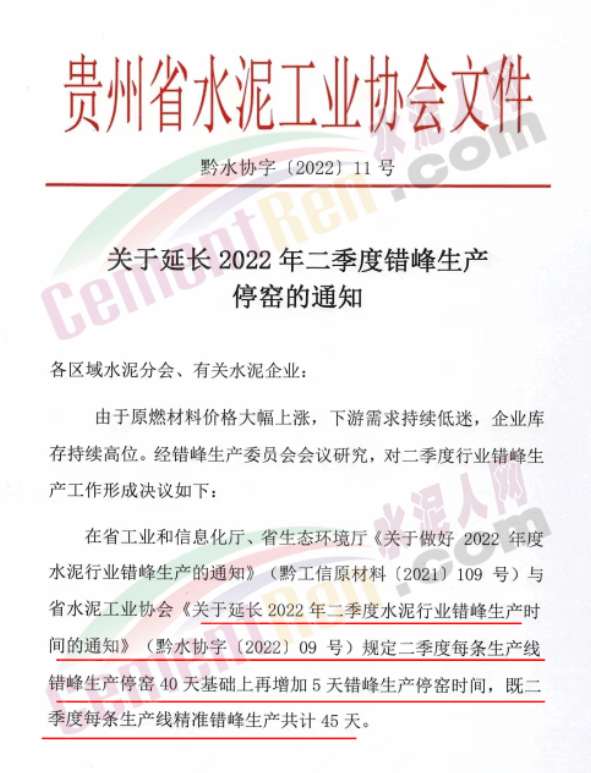 在貴州省工業(yè)和信息化廳、省生態(tài)環(huán)境廳《關(guān)于做好2022年度水泥行業(yè)錯(cuò)峰生產(chǎn)的通知》與省水泥工業(yè)協(xié)會(huì)《關(guān)于延長(zhǎng)2022年二季度水泥行業(yè)錯(cuò)峰生產(chǎn)時(shí)間的通知》規(guī)定二季度每條生產(chǎn)線錯(cuò)峰生產(chǎn)停窯40天基礎(chǔ)上再增加5天錯(cuò)峰生產(chǎn)停窯時(shí)間,既二季度每條生產(chǎn)線精準(zhǔn)錯(cuò)峰生產(chǎn)共計(jì)45天。有關(guān)要求如下∶