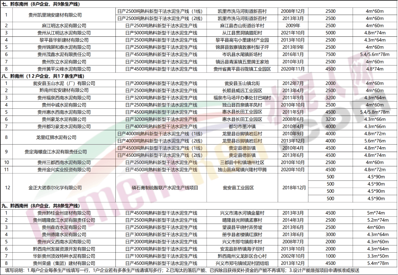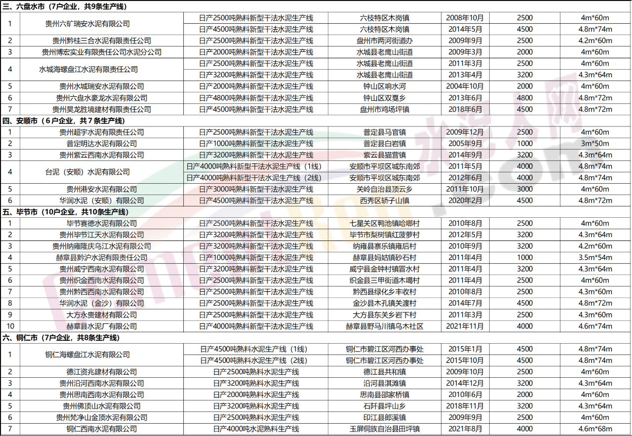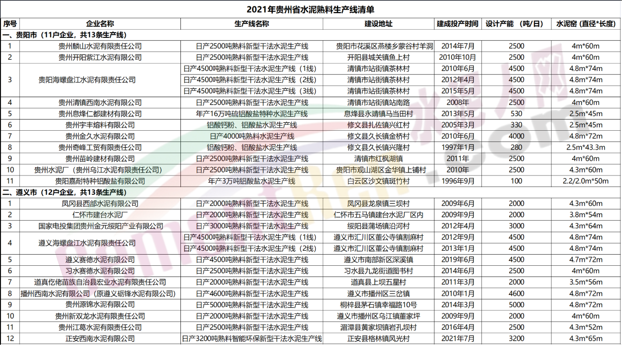 從貴州省工信廳發(fā)布的《2021年度水泥熟料生產(chǎn)線清單》可見貴州省內(nèi)共有水泥熟料生產(chǎn)線94條,合計(jì)產(chǎn)能8449.2萬噸。