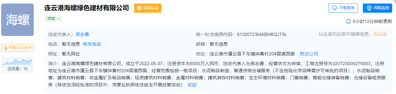 天眼查數(shù)據(jù)顯示,海螺綠色建材成立于2022年5月7日,法定代表人為吳志勇,注冊資本為5000萬元人民幣。該公司經(jīng)營范圍包括水泥制品制造、普通貨物倉儲服務(wù)(不含危險化學(xué)品等需許可審批的項(xiàng)目)等。海螺水泥持該公司股份100%。