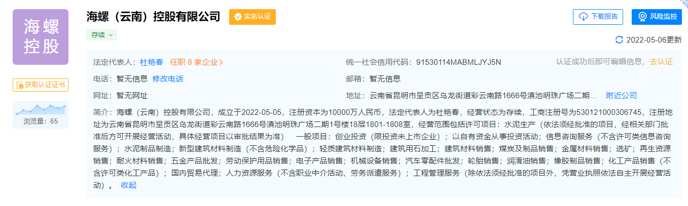 天眼查數(shù)據(jù)顯示,海螺(云南)控股有限公司成立于2022年5月5日,注冊資本1億元,法人代表為杜艷春,經(jīng)營范圍包括:水泥生產(chǎn);創(chuàng)業(yè)投資(限投資未上市企業(yè));以自有資金從事投資活動;信息咨詢服務(wù)(不含許可類信息咨詢服務(wù))等。目前,其由海螺水泥100%持股。