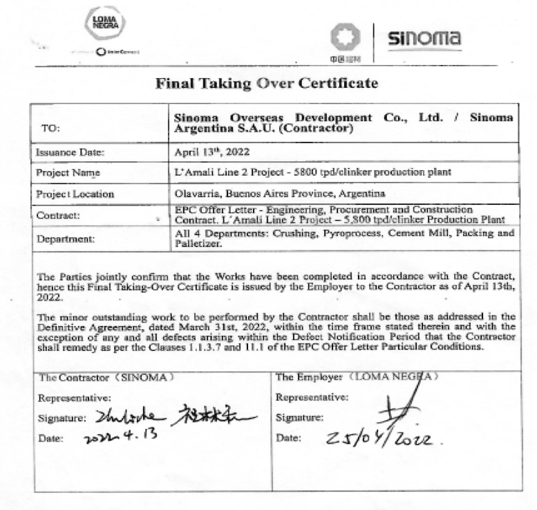 近日,中材海外工程有限公司總承包的“阿根廷L’Amali二號線日產(chǎn)5800噸水泥熟料生產(chǎn)線項目”正式獲得業(yè)主Loma Negra簽發(fā)的最終TOC證書,該證書生效日期為4月13日。