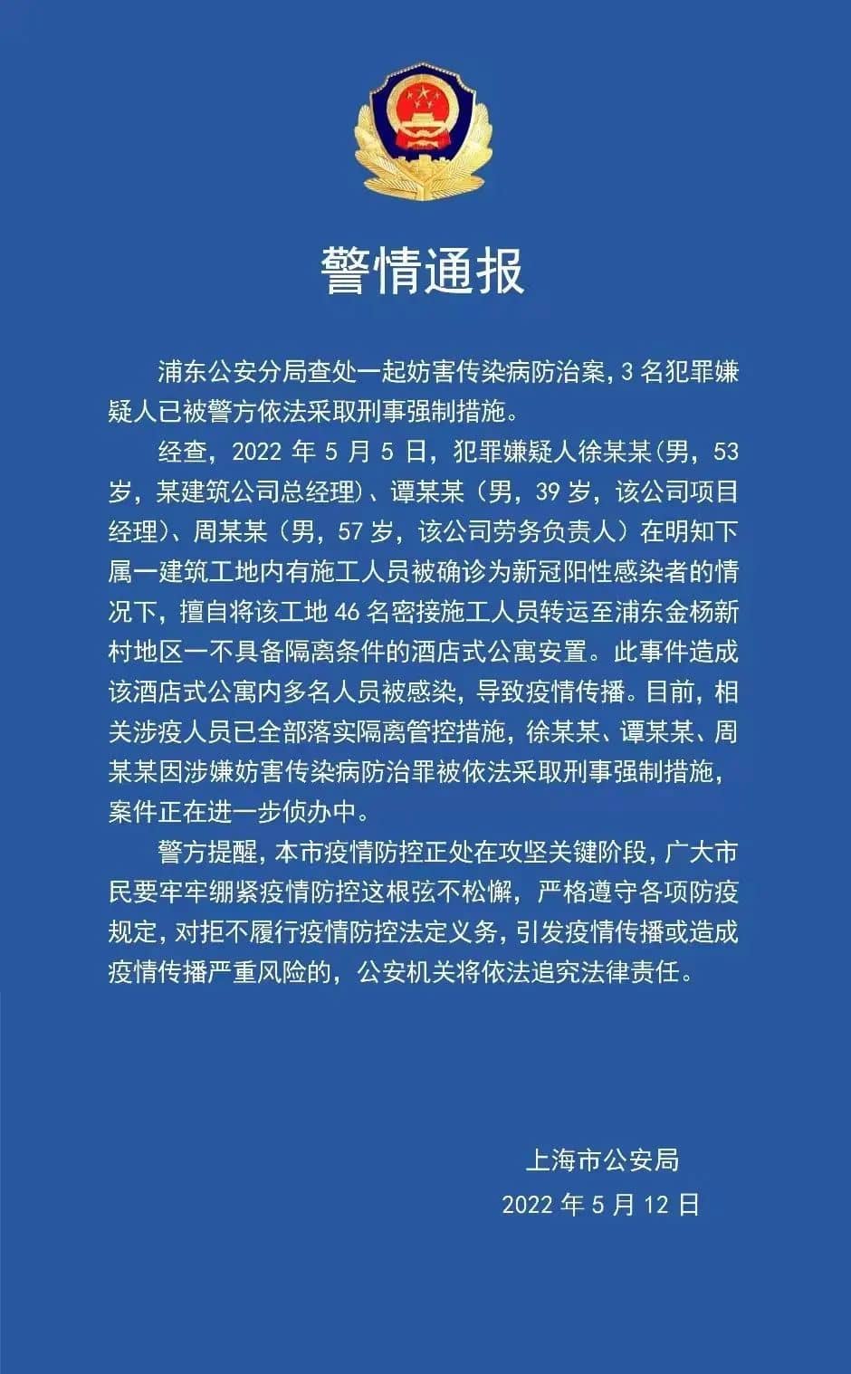 經(jīng)查,2022年5月5日,犯罪嫌疑人徐某某(男,53歲,某建筑公司總經(jīng)理)、譚某某(男,39歲,該公司項目經(jīng)理)、周某某(男,57歲,該公司勞務(wù)負(fù)責(zé)人)在明知下屬一建筑工地內(nèi)有施工人員被確診為新冠陽性感染者的情況下,擅自將該工地46名密接施工人員轉(zhuǎn)運至浦東金楊新村地區(qū)一不具備隔離條件的酒店式公寓安置。