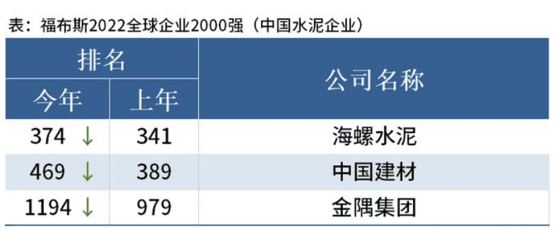 5月12日晚,福布斯2022全球企業(yè)2000強發(fā)布,其中以水泥為主營業(yè)務的企業(yè)中,海螺水泥、中國建材、金隅股份分別名列第374位、469位、1194位。三家企業(yè)較上年位次均有下滑。海螺水泥價341位下滑至374位。金隅集團跌出1000位之外。