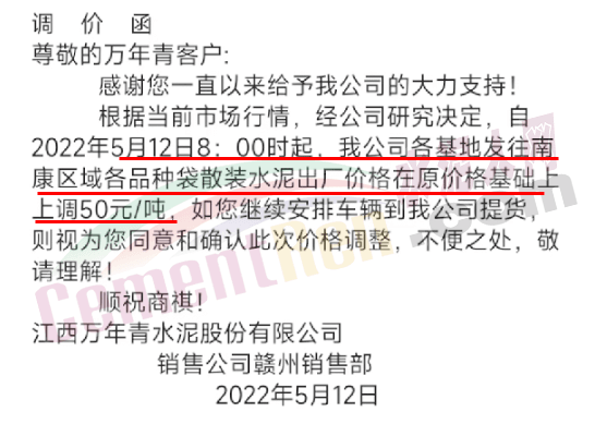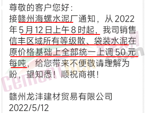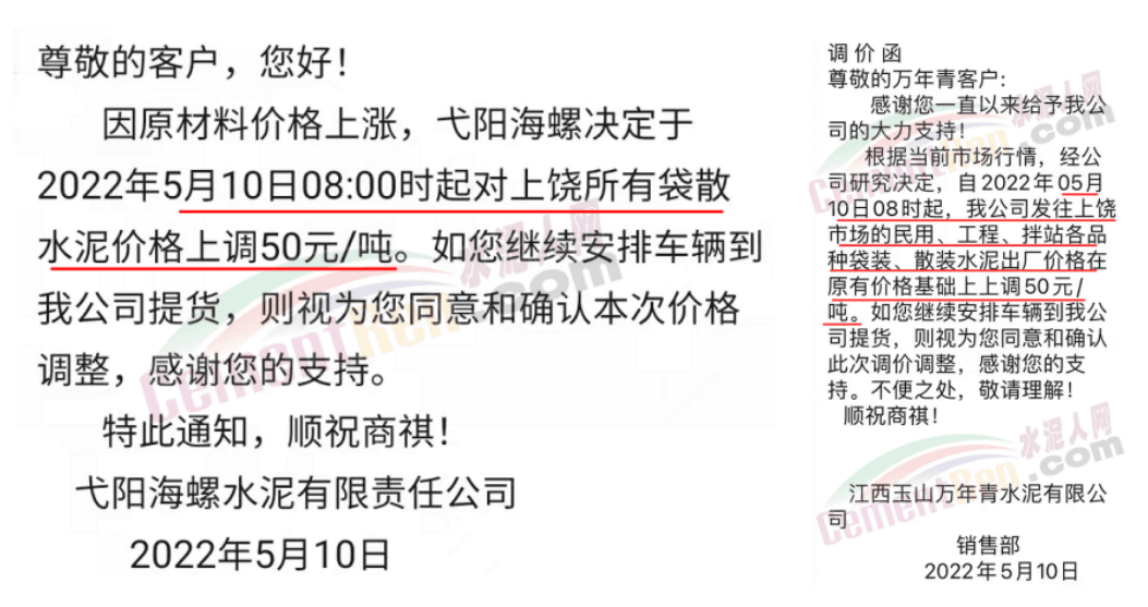5月10日弋陽(yáng)海螺水泥、江西萬(wàn)年青,對(duì)上饒所有袋散水泥價(jià)格上調(diào)50元/噸。