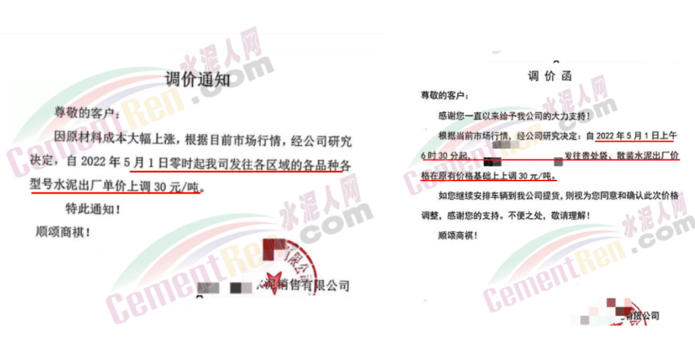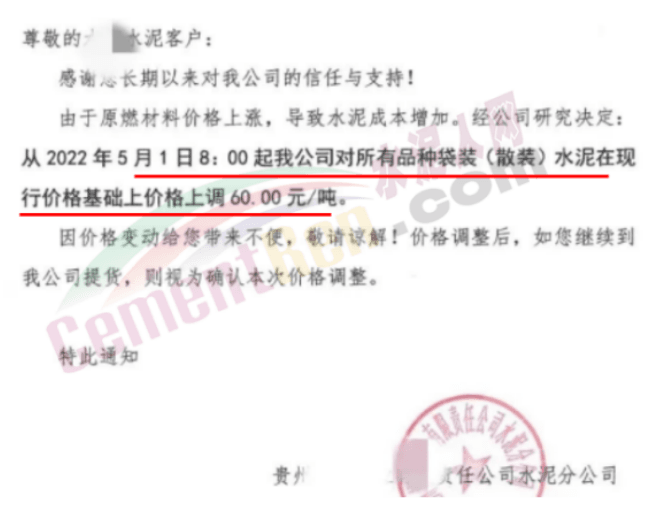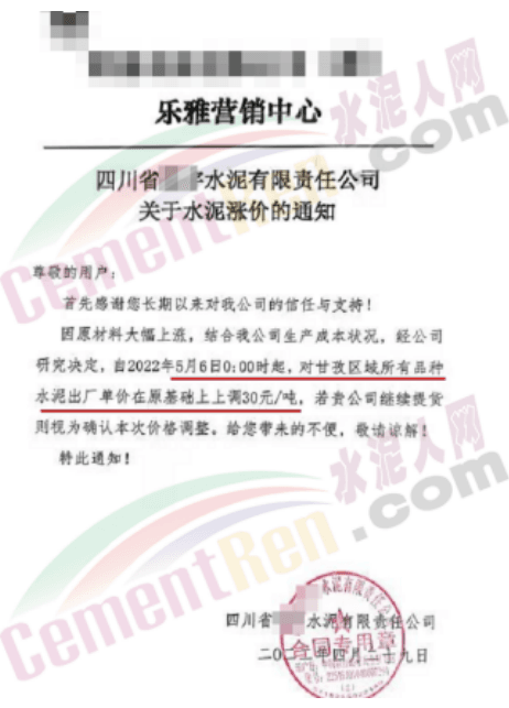 5月6日四川某水泥企業(yè)通知,對(duì)甘孜區(qū)域所有品種水泥出廠價(jià)上調(diào)30元/噸。