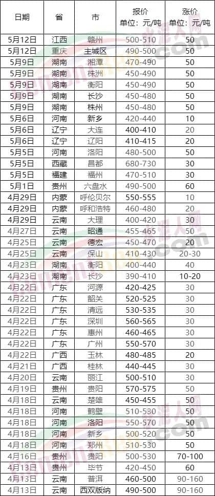 漲價(jià)函滿天飛,云南、貴州區(qū)域上漲超100元/噸