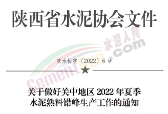 4月29日,陜西省水泥協(xié)會發(fā)布關(guān)于做好關(guān)中地區(qū)2022年夏季水泥熟料錯峰生產(chǎn)工作的通知,要求關(guān)中地區(qū)所有水泥熟料生產(chǎn)線于2022年6月1日至7月31日期間錯峰停窯30天/線。
