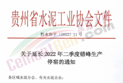 貴州省水泥工業(yè)協(xié)會發(fā)布《關(guān)于延長2022年二季度錯峰生產(chǎn)停窯的通知》要求貴州區(qū)域所有水泥熟料生產(chǎn)線二季度每條生產(chǎn)線精準(zhǔn)錯峰生產(chǎn)共計45天。