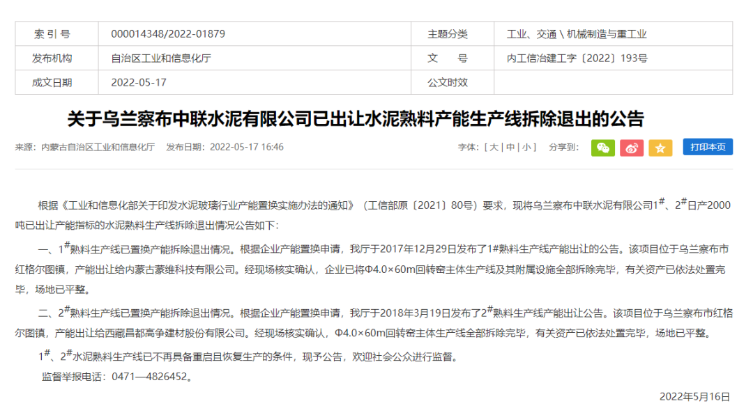 5月16日,內(nèi)蒙古自治區(qū)工信廳發(fā)布《關(guān)于烏蘭察布中聯(lián)水泥有限公司已出讓水泥熟料產(chǎn)能生產(chǎn)線拆除退出的公告》稱,烏蘭察布中聯(lián)水泥有限公司1#、2#日產(chǎn)2000噸已出讓產(chǎn)能指標的水泥熟料生產(chǎn)已不再具備重啟且恢復生產(chǎn)的條件。