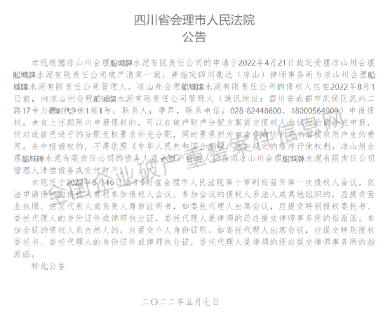 5月7日四川省會理市人民法院公告,根據(jù)涼山州會理船城牌水泥有限責(zé)任公司的申請于2022年4月21日裁定受理涼山州會理船城牌水泥有限責(zé)任公司破產(chǎn)清算一案,并指定四川毫達(涼山)律師事務(wù)所為涼山州會理船城牌水泥有限責(zé)任公司管理人。