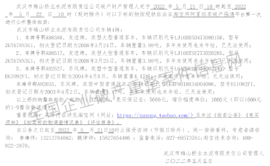 5月5日,武漢市梅山橋業(yè)水泥有限責(zé)任公司管理人發(fā)布《剩余破產(chǎn)財產(chǎn)拍賣公告》稱,武漢市梅山橋業(yè)水泥有限責(zé)任公司破產(chǎn)財產(chǎn)管理人定于2022年5月21日10時起至2022年5月22日10時對標的物按現(xiàn)狀依法在淘寶網(wǎng)阿里拍賣破產(chǎn)強清平臺第一次進行公開整體拍賣。