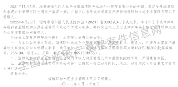 淄博聯(lián)和水泥企業(yè)管理有限公司管理人發(fā)布公告稱,2021年11月2日,淄博市淄川區(qū)人民法根據(jù)淄博聯(lián)合水泥企業(yè)管理有限公司的申請,裁定受理淄博聯(lián)和水泥企業(yè)管理有限公司破產(chǎn)清算一案,并指定山東子誠律師事務(wù)所擔(dān)任淄博聯(lián)和水泥企業(yè)管理有限公司管理人。2022年4月26日,淄博市淄川區(qū)人民法院作出決定,準許山東子誠律師事務(wù)所辭去淄博聯(lián)和水泥企業(yè)管理有限公司管理人職務(wù),并指定山東正大至誠律師事務(wù)所擔(dān)任淄博聯(lián)和水泥企業(yè)管理有限公司管理人。