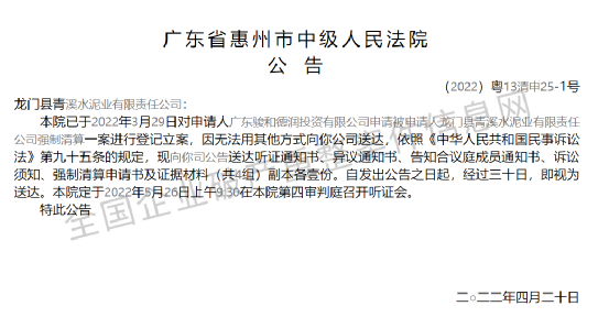 4月20日廣東省惠州市中級人民法院發(fā)布公告稱,法院已于2022年3月29日對申請人廣東駿和德潤投資有限公司申請被申請人龍門縣青溪水泥業(yè)有限責(zé)任公司強制清算一案進行登記立案,因無法用其他方式向龍門縣青溪水泥業(yè)有限責(zé)任公司送達,依照《中華人民共和國民事訴訟法》第九十五條的規(guī)定,現(xiàn)向其公告送達聽證通知書、異議通知書、告知合議庭成員通知書、訴訟須知、強制清算申請書及證據(jù)材料(共4組)副本等。