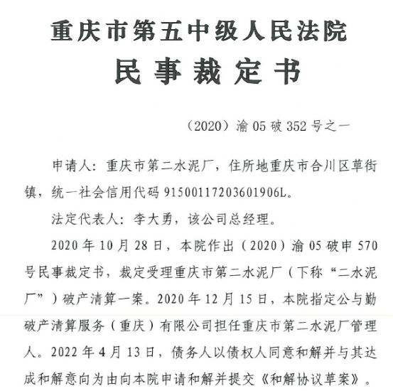 4月19日重慶市第五中級人民法院民事裁定書顯示,重慶市第二水泥廠在法院受理破產(chǎn)申請后,宣告破產(chǎn)。債務(wù)人提出的和解協(xié)議草案載明了清償債務(wù)的資金來源、清償比例、期限等,符合法律規(guī)定。予以準許。