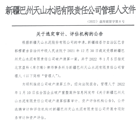 1月23日新疆巴州天山水泥管理人發(fā)布《關(guān)于選定審計、評估機構(gòu)的公告》稱,為順利推進公司破產(chǎn)清算工作,經(jīng)向法院報告管理人于1月10日在全國破產(chǎn)重整案件信息網(wǎng)發(fā)布選聘審計和評估機構(gòu)對新疆巴州天山水泥有限責(zé)任公司開展專項財務(wù)審計和資產(chǎn)評估。