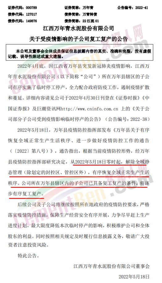 5月18日,江西萬年青水泥股份有限公司(以下簡稱“萬年青”)發(fā)布關(guān)于受疫情影響的子公司復(fù)工復(fù)產(chǎn)的公告。