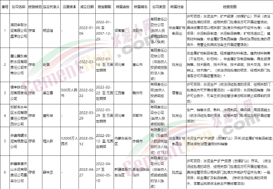 據(jù)查詢,近一年來(lái)注冊(cè)名稱中含有“水泥有限公司”和“水泥有限責(zé)任公司”的企業(yè)共97家。其中2022年注冊(cè)成立的企業(yè)共14家,涉及水泥及熟料生產(chǎn)的企業(yè)包括新疆阜康天山水泥有限責(zé)任公司昌吉分公司、洛陽(yáng)中聯(lián)水泥有限公司孟津分公司、唐山冀東啟新水泥有限責(zé)任公司豐南分公司、赤峰海螺水泥有限責(zé)任公司等共6家。
