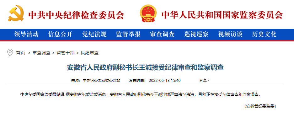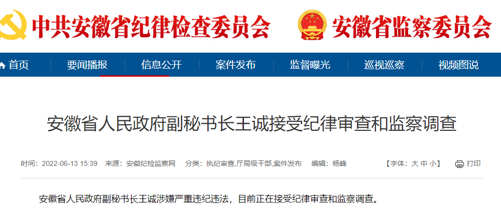 據(jù)安徽省紀委監(jiān)委消息:安徽省人民政府副秘書長王誠涉嫌嚴重違紀違法,目前正在接受紀律審查和監(jiān)察調(diào)查。