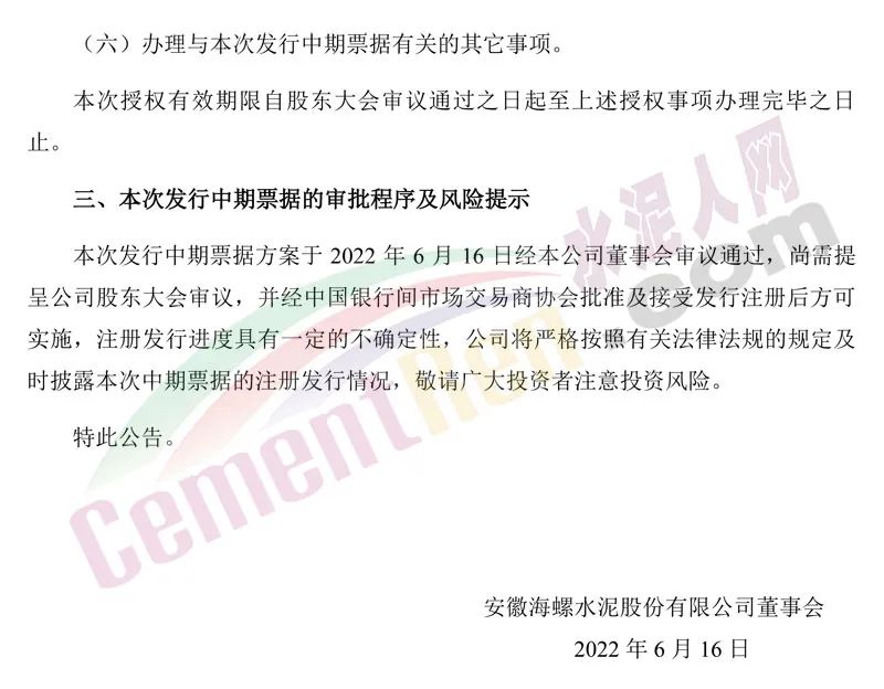6月16日晚間,海螺水泥發(fā)布《關于擬注冊發(fā)行中期票據(jù)的公告》稱,為滿足公司經(jīng)營發(fā)展需要,進一步拓寬融資渠道,降低融資成本,優(yōu)化債務結(jié)構,經(jīng)董事會審議批準,安徽海螺水泥股份有限公司(以下簡稱“公司”或“本公司”)擬向中國銀行間市場交易商協(xié)會申請注冊發(fā)行不超過人民幣100億元(含100億元)中期票據(jù)。