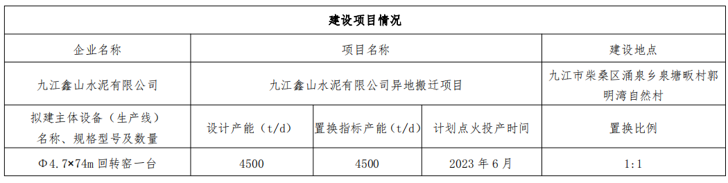 據(jù)水泥人網(wǎng)了解,早在2020年11月江西工信廳發(fā)布九江鑫山水泥有限公司公司 4500t/d水泥熟料生產(chǎn)線產(chǎn)能置換的公示提到,九江鑫山水泥有限公司由于處于九江高鐵新區(qū)核心區(qū)域內(nèi),不符合城市發(fā)展規(guī)劃要求,需進(jìn)行異地搬遷。該企業(yè)將異地搬遷一條4500t/d水泥熟料生產(chǎn)線至九江市柴桑區(qū)涌泉鄉(xiāng)泉塘畈村郭明灣自然村,其中置換比例為1:1。