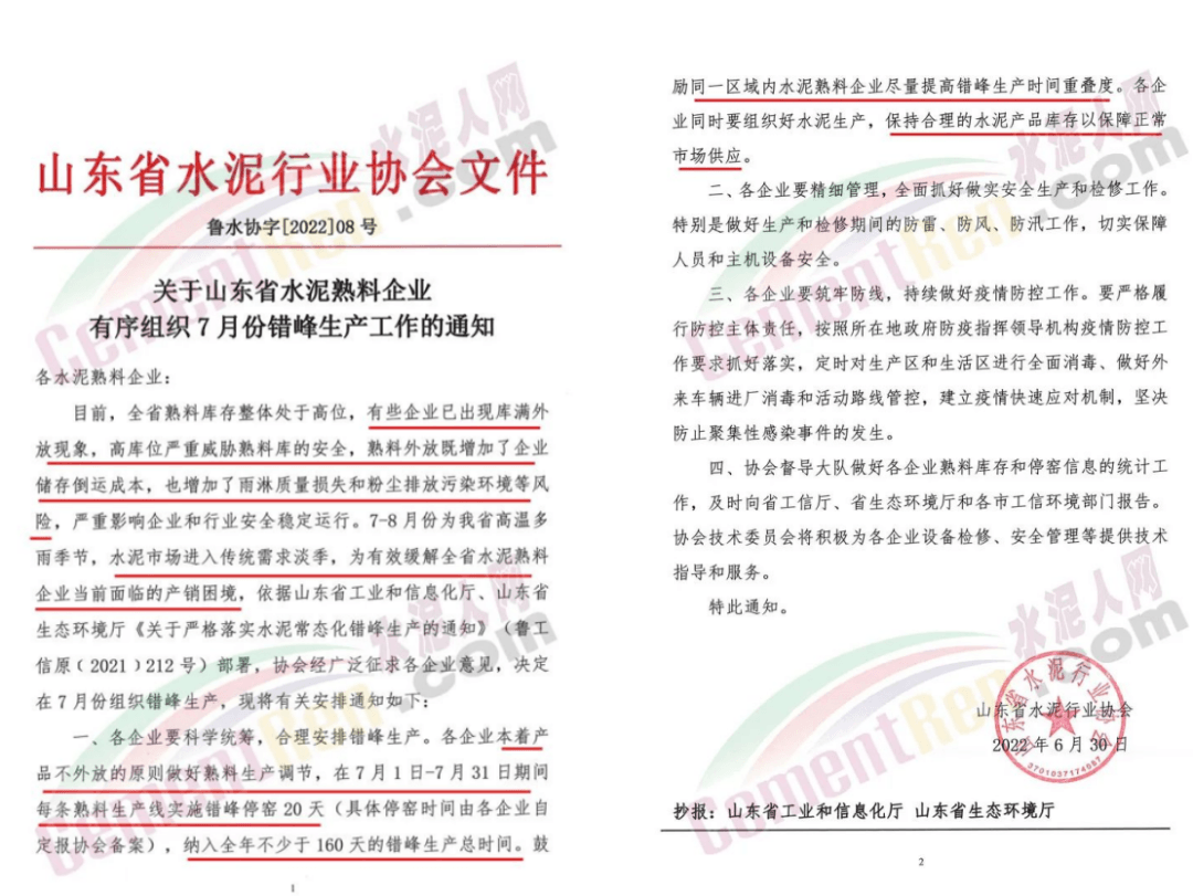山東省水泥行業(yè)協(xié)會發(fā)布《關(guān)于山東省水泥熟料企業(yè)有序組織7月份錯峰生產(chǎn)工作的通知》提到,全省熟料庫存整體處于高位,有些企業(yè)已出現(xiàn)庫滿外放現(xiàn)象,高庫位嚴重威脅熟料庫的安全,熟料外放既增加了企業(yè)儲存倒運成本,也增加了雨淋質(zhì)量損失和粉塵排放污染環(huán)境等風險。通知要求各企業(yè)本著產(chǎn)品不外放的原則做好熟料生產(chǎn)調(diào)節(jié),在7月1日-31日期間每條熟料生產(chǎn)線實施錯峰停窯20天,納入全年不少于160天的錯峰生產(chǎn)總時間。