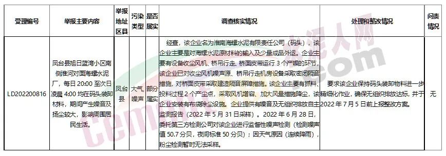 鳳臺縣旭日藍(lán)灣小區(qū)南側(cè)淮河對面海螺水泥廠,每日20:00至次日凌晨4:00均在碼頭裝卸材料,期間產(chǎn)生噪音及揚(yáng)塵較大,影響周圍居民生活。