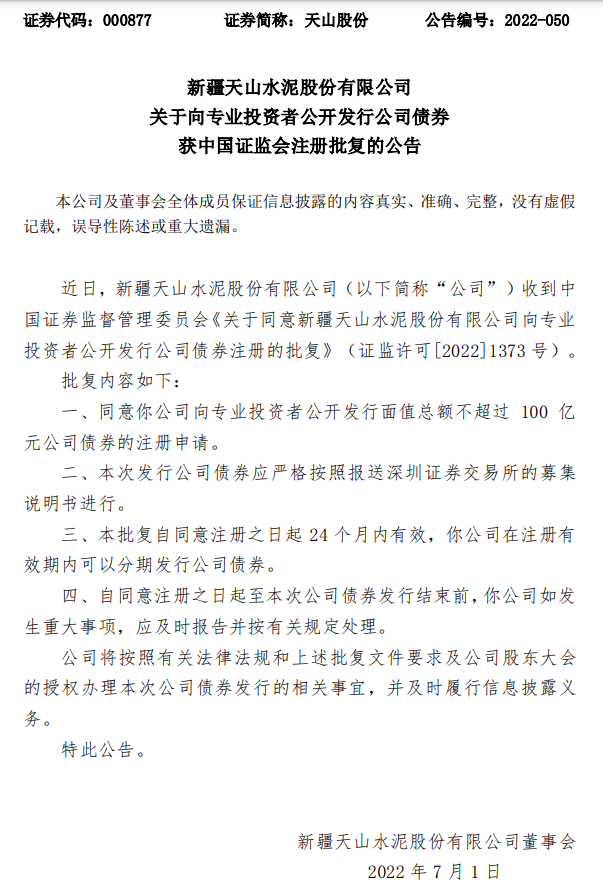 近日,新疆天山水泥股份有限公司(以下簡稱“公司”)收到中國證券監(jiān)督管理委員會《關(guān)于同意新疆天山水泥股份有限公司向?qū)I(yè)投資者公開發(fā)行公司債券注冊的批復(fù)》(證監(jiān)許可[2022]1373號)。批復(fù)內(nèi)容為同意天山水泥向?qū)I(yè)投資者公開發(fā)行面值總額不超過100億元公司債券的注冊申請。