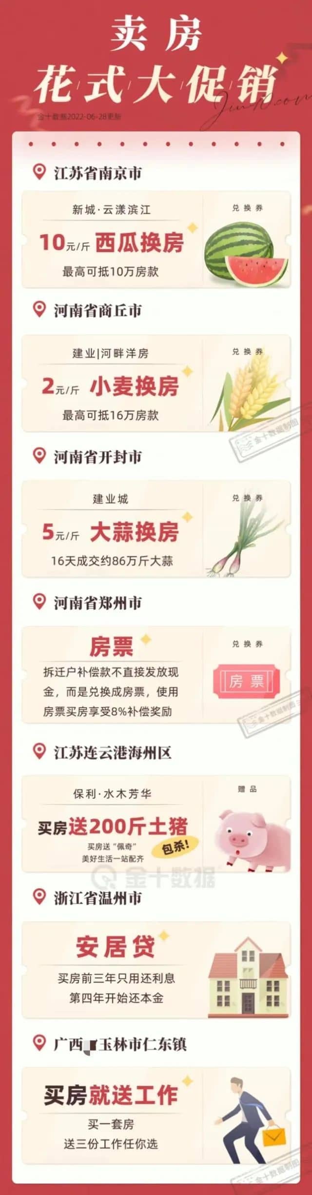 6 月 28 日,新城控股位于南京江寧的云漾濱江項(xiàng)目海報(bào)上赫然寫著 “ 西瓜換房最高抵 100000 元”,西瓜 10 元/斤,每套房收購(gòu)上限為 1 萬(wàn)斤。