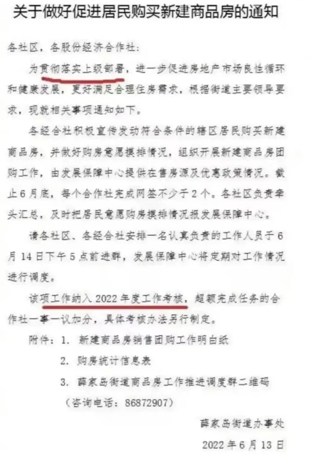 山東青島把賣房納入了工作人員考核范圍之內(nèi),比如青島市西海岸新區(qū)某街道辦事處一則名為《關(guān)于做好促進(jìn)居民購(gòu)買新建商品房的通知》廣為流傳。通知要求各社區(qū)、各股份經(jīng)濟(jì)合作社,發(fā)動(dòng)轄區(qū)居民購(gòu)買新建商品房,組織新建商品房團(tuán)購(gòu),至6月底每個(gè)合作社完成網(wǎng)簽不少于2個(gè),并將該項(xiàng)工作納入2022年度工作考核。對(duì)此社區(qū)工作人員表示,“完不成的話,我們社區(qū)是要扣分的,社區(qū)書記也是有可能要被扣錢的。”