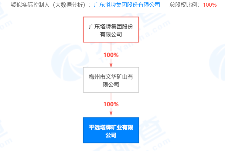 企業(yè)疑似實際控制人為廣東塔牌集團股份有限公司,總股權(quán)比例達100%。