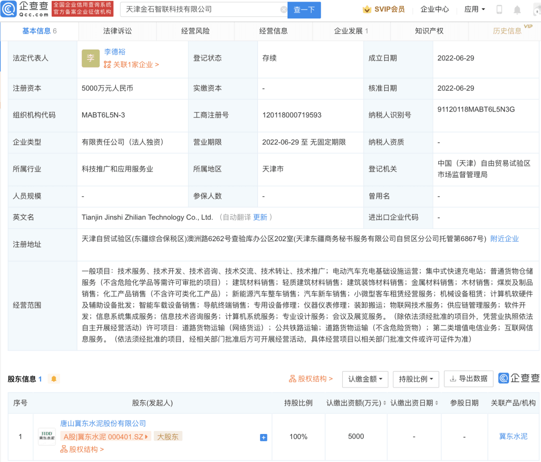 天眼查APP顯示,6月29日,天津金石智聯(lián)科技有限公司成立,法定代表人為李德裕,注冊資本5000萬元,經(jīng)營范圍包含:電動汽車充電基礎(chǔ)設(shè)施運(yùn)營;集中式快速充電站;新能源汽車整車銷售;汽車新車銷售;小微型客車租賃經(jīng)營服務(wù)等。企查查股權(quán)穿透顯示,該公司由冀東水泥100%控股。