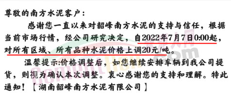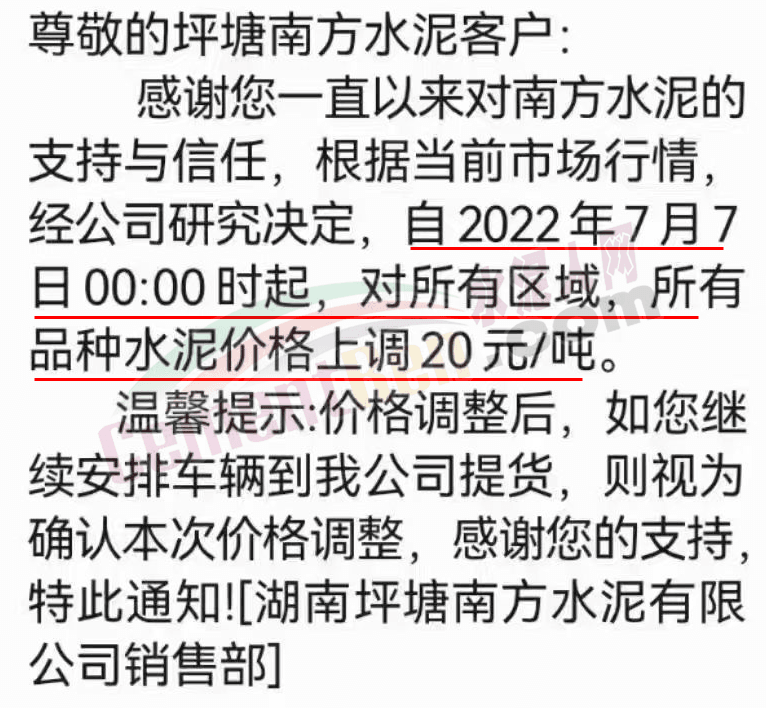 湖南金山水泥通知,由于公司原材料價格大幅上漲,結(jié)合公司當(dāng)前銷售形勢,經(jīng)公司研究決定,自7月5日0時起對包裝各規(guī)格水泥產(chǎn)品價格上調(diào)20元/噸。