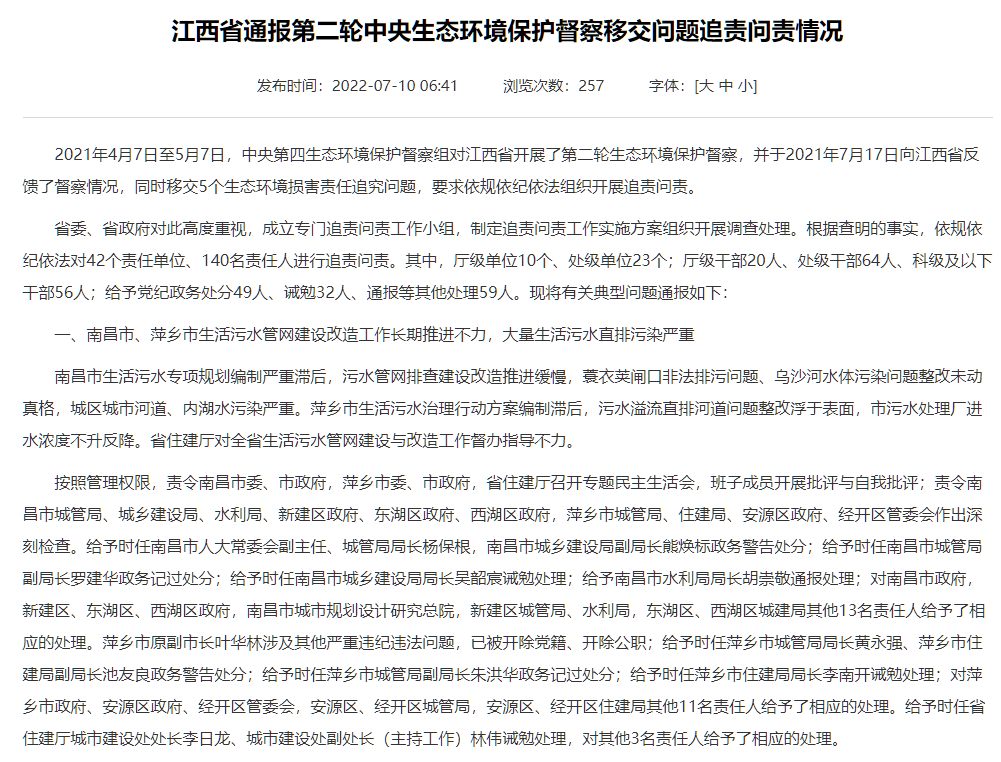 日前,江西省人民政府官網(wǎng)發(fā)布《江西省通報(bào)第二輪中央生態(tài)環(huán)境保護(hù)督察移交問題追責(zé)問責(zé)情況》其中提到,2021年4月7日至5月7日,中央第四生態(tài)環(huán)境保護(hù)督察組對(duì)江西省開展了第二輪生態(tài)環(huán)境保護(hù)督察,并于2021年7月17日向江西省反饋了督察情況,同時(shí)移交5個(gè)生態(tài)環(huán)境損害責(zé)任追究問題,要求依規(guī)依紀(jì)依法組織開展追責(zé)問責(zé)。
