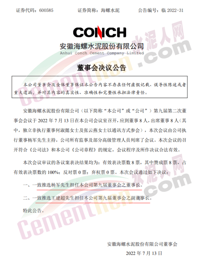 海螺水泥(600585)7月13日晚間公告,公司第九屆第二次董事會(huì)會(huì)議于當(dāng)日召開(kāi),會(huì)議一致推選楊軍擔(dān)任公司第九屆董事會(huì)之董事長(zhǎng);一致推選王建超擔(dān)任公司第九屆董事會(huì)之副董事長(zhǎng)。