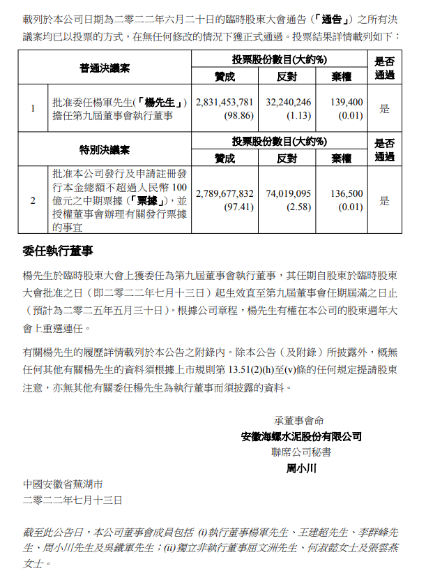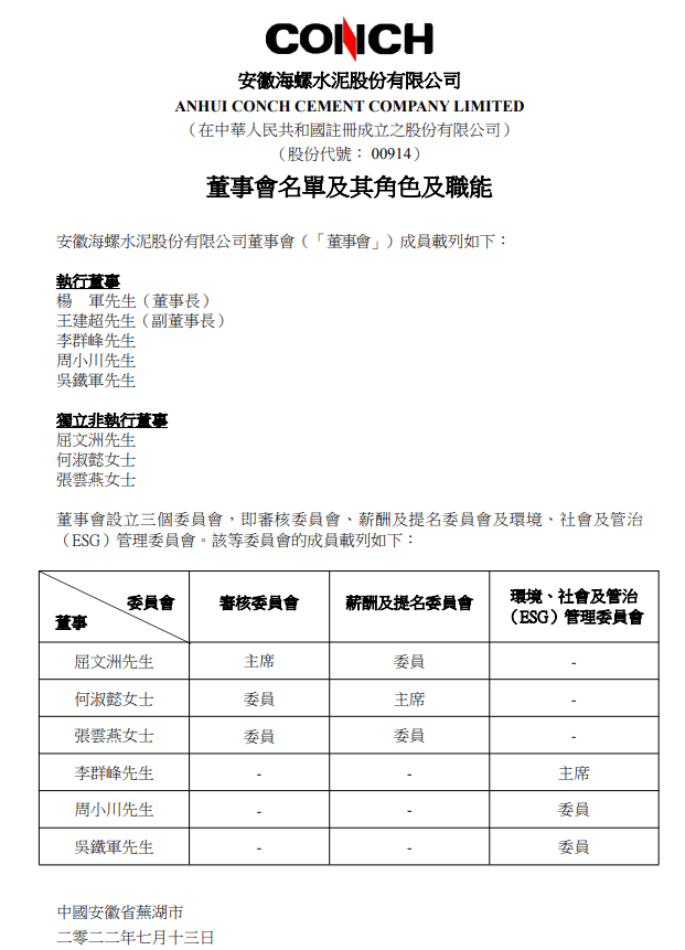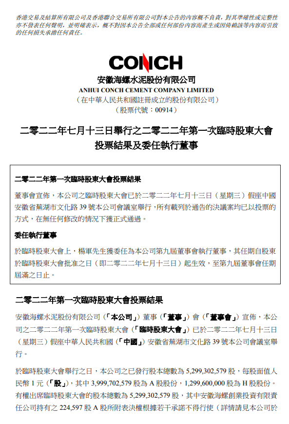 楊先生于二零二二年五月加入安徽海螺集團(tuán)有限責(zé)任公司(「海螺集團(tuán)」),現(xiàn)擔(dān)任海螺集團(tuán)黨委書(shū)記、董事長(zhǎng)。