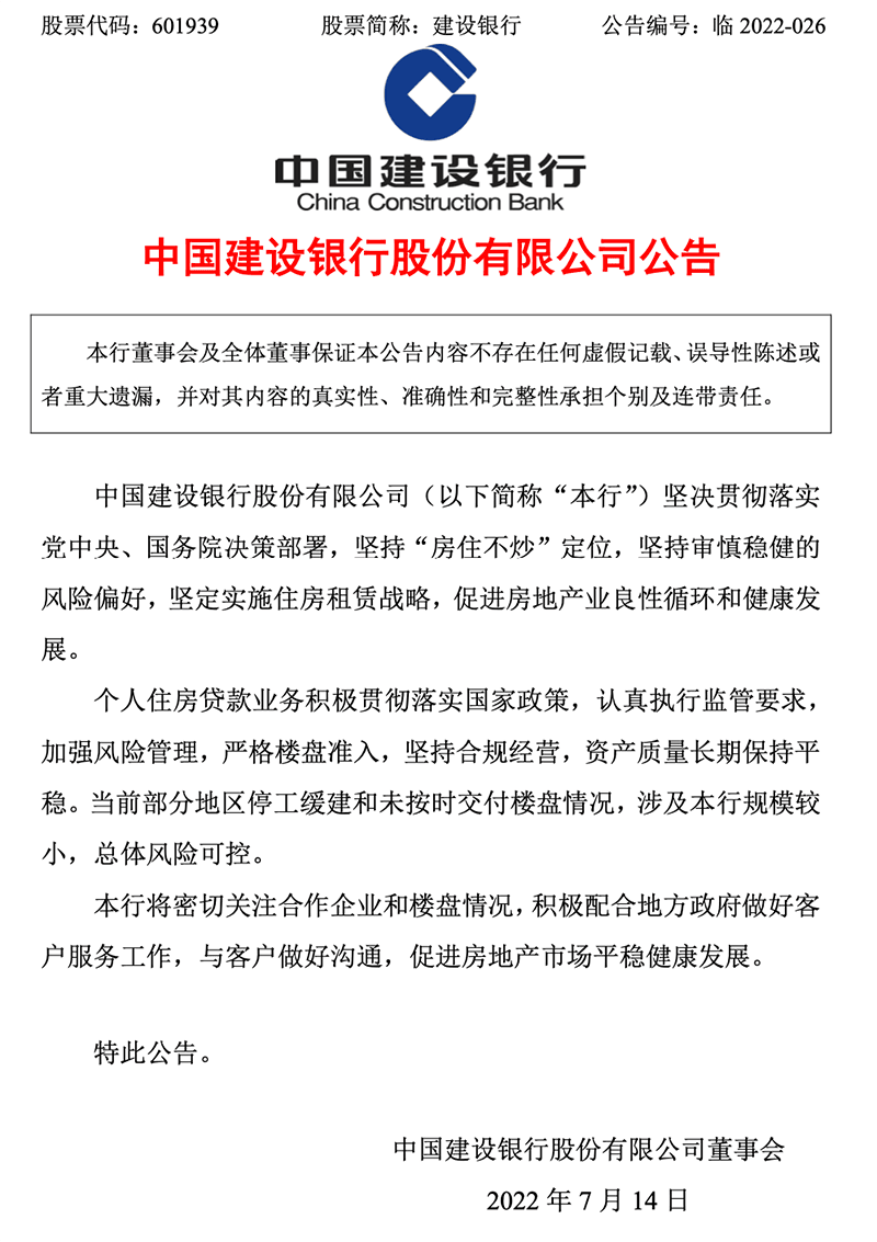 建設(shè)銀行稱,將密切關(guān)注合作企業(yè)和樓盤(pán)情況,積極配合地方政府做好客戶服務(wù)工作,與客戶做好溝通,促進(jìn)房地產(chǎn)市場(chǎng)平穩(wěn)健康發(fā)展。